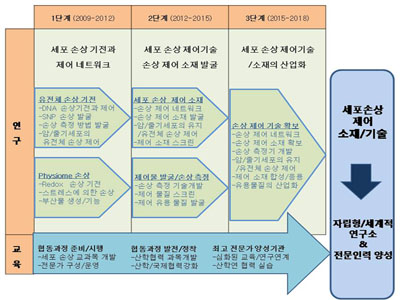 3단계 (심화 및 자립 단계): 세계 수즌의 연구팀으로 발전하여, 세포손상제어 소재 및 모니터링 기술을 발굴하고 기술이전 함으로써 자립화의 기반을 확보함.