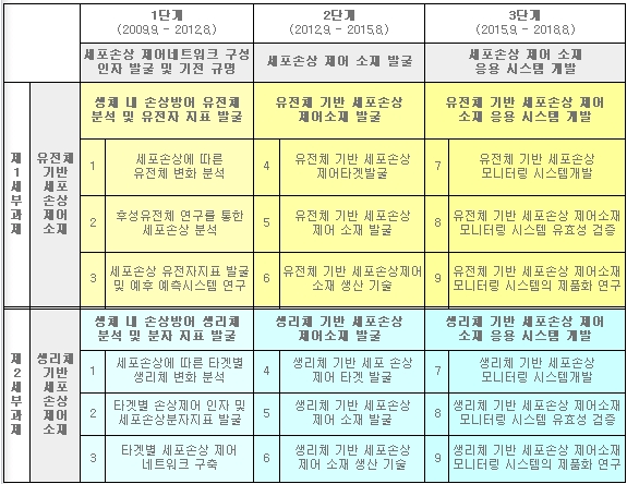 (2012-2015년): 세포 손상제어에 대한 기전과 네트워크 구축, 물리/화학적 방법에 의한 세포 손상에 대한 측정 방법 개발, 천연물과 약물 라이브러리 스크린 등으로 부터 세포 손상제어에 효능 있는 약물 후보 물질을 확보함. 이를 위해 물리와 화학분야의 전문가를 본 연구팀에 충원하여 손상에 대한 측정과 약물의 스크린 및 합성에 관련된 부분을 강화함.